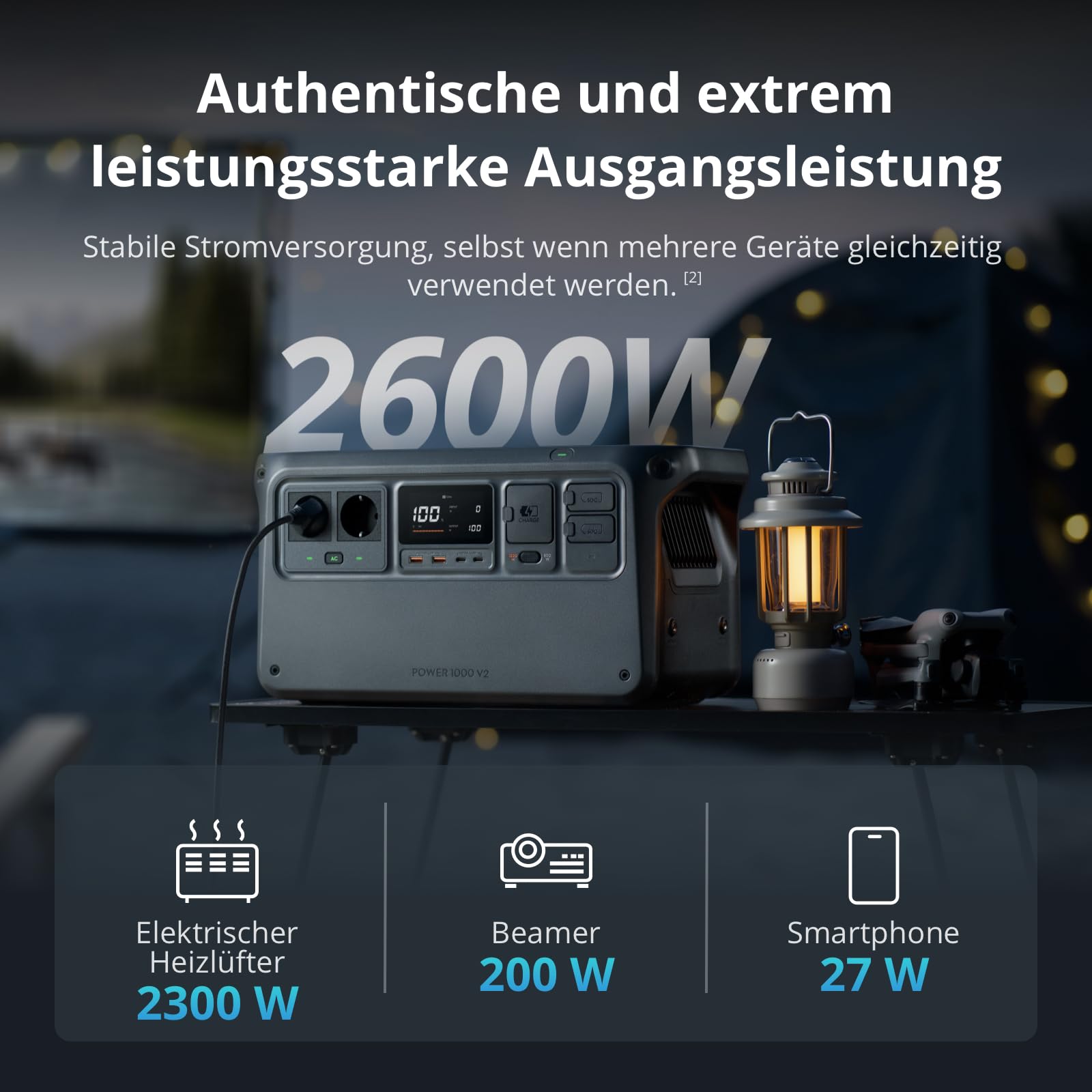 - Mehr Leistung als je zuvor – Die DJI Power 1000 V2 Powerstation ist ein leistungsstarker Solargenerator, der 99 % [11] der Geräte wie Wasserkocher, Kochplatten, Projektoren, Sägen und Bohrmaschinen mit Strom versorgt.