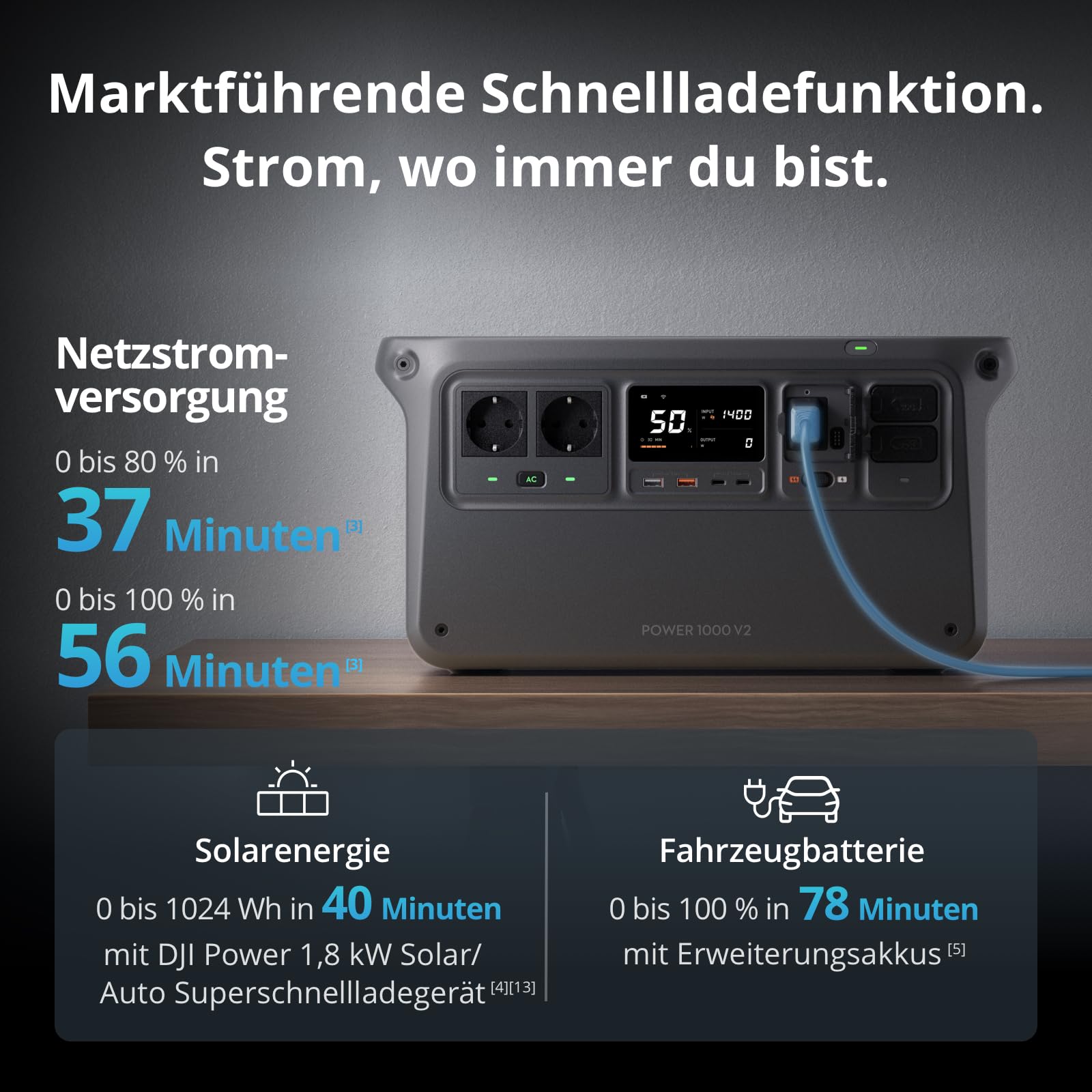Die DJI Power 1000 V2 bietet Schnellladung über zwei 140-W-USB-C-Anschlüsse und unterstützt zudem die SDC-Schnellladung für DJI-Drohnen. Sie lädt in nur 37 Minuten auf 80 % und läuft flüsterleise bei nur 26 dB – perfekt für den Einsatz zu Hause oder beim Camping. Mit einem LFP-Akku für 10 Jahre Lebensdauer, flexiblen Lademöglichkeiten und erweiterbarem Zubehör ist sie auf langfristige, vielseitige Energieversorgung unterwegs ausgelegt.