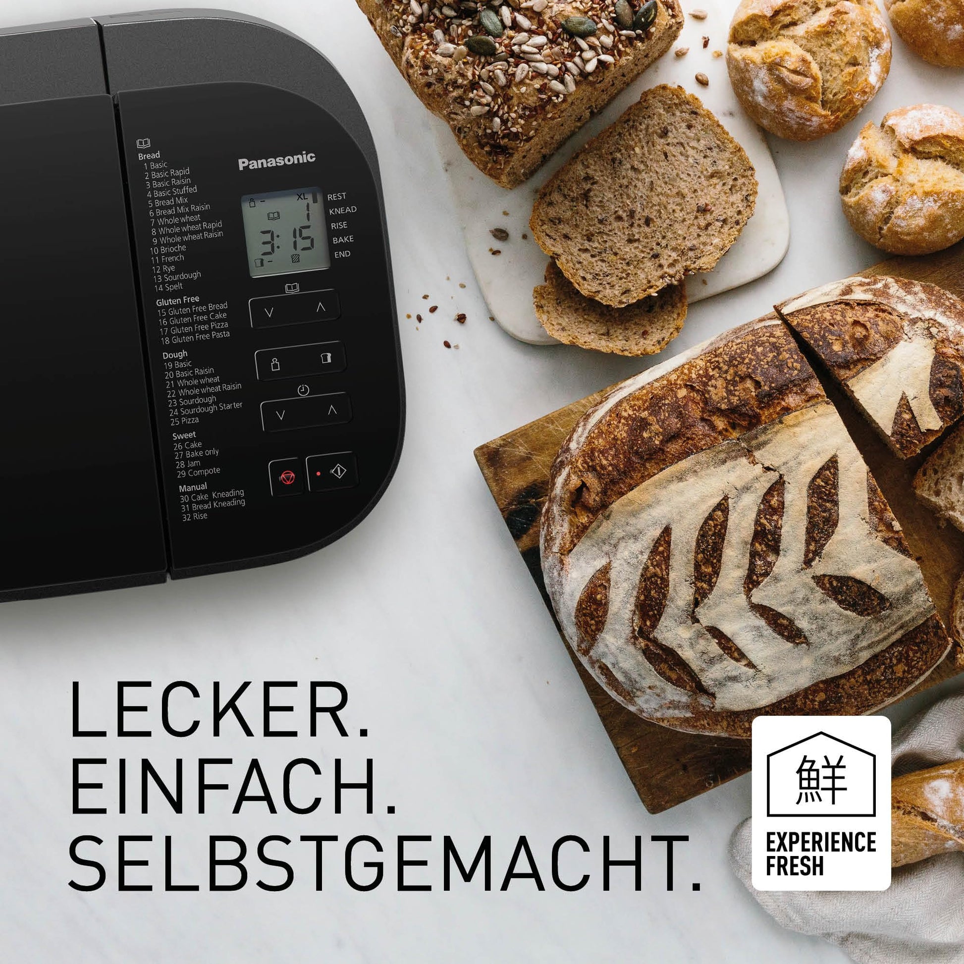 Einzelheiten: Panasonic SD-YR2540 Backautomat / 32 Brotprogramme / 14 Automatikprogramme / Hefeverteiler / manuelle Gär- und Knetprogramme/ 2 Knethaken/ Timer - Mit dem Panasonic Brotbackautomaten gelingen Ihnen schnell und einfach frische Backkreationen. Wählen Sie aus 32 unterschiedlichen Programmen – egal ob Vollkornbrot oder Sauerteigbrot, Pizzateig oder Kuchen – dem kulinarischen Genuss sind mit der SD-YR2540 Brotbackmaschine keine Grenzen gesetzt. Auch leckeres Dinkelbrot mit seinem nussigen Geschmack gelingt mit dem Dinkelbrotprogramm ohne Probleme. Mit den manuellen Einstellungen mit individuellen Knet- und Aufgehzeiten sind Sie beim Backen ohne mühsames Kneten von Hand kreativ und dank des intelligenten Hefeverteilers geht jeder Teig optimal auf. Schon abends die Zutaten mischen und morgens zum Duft von frisch gebackenem Brot aufwachen? Das geht dank der praktischen Zeitvorwahl bis zu 13 Stunden. Zwei Temperatursensoren garantieren die optimale Backtemperatur für besonders schmackhafte Backergebnisse. Backen Sie ganz nach Bedarf mittlere, große oder extragroße Brot in drei verschiedenen Bräunungsgraden. Nie war es einfacher, Brot selber zu backen - lassen Sie Ihrer Kreativität mit dem Panasonic Brotbäcker freien Lauf!
