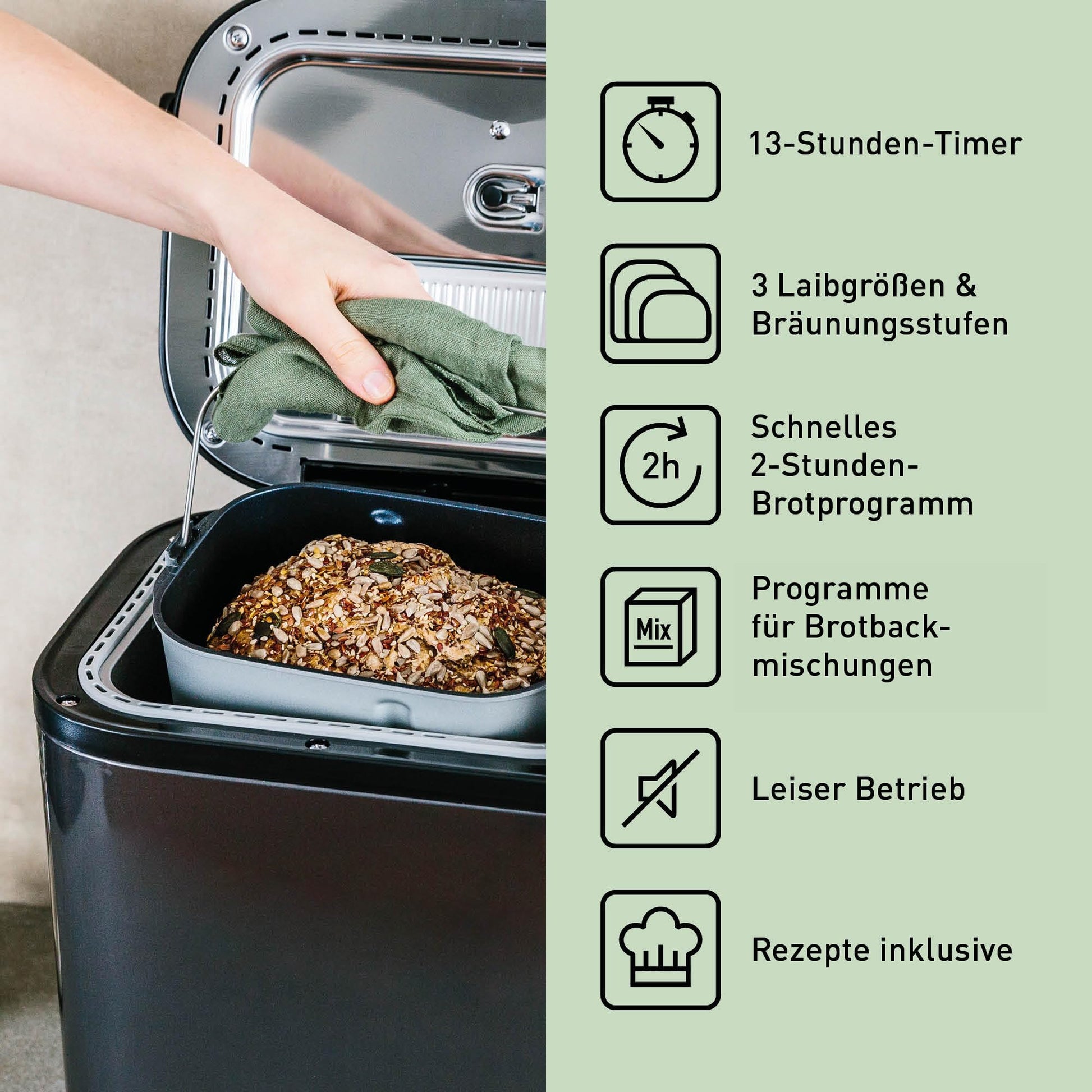 - KNETEN OHNE HÄNDE: Dieser Brotbackautomat verfügt über einen innovativen Knethaken mit speziell platzierten Lamellen in der Backform, um Handkneten nachzuahmen und Ihnen jedes Mal das beste Brot mit der idealen Textur zu servieren